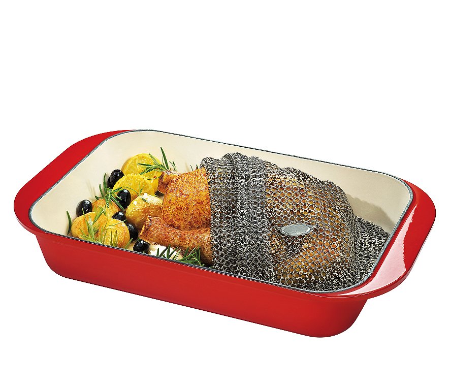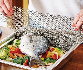 Hier gehen Fisch, Fleisch und Gemüse gerne ins Netz. Die flexible Matte verhindert ein Austrocknen des Garguts, vermeidet Fettspritzer, und die Hitze wird besser verteilt. So gelingt der saftige Braten, das Hähnchen bekommt die begehrte Knusperhaut und Gemüse behält seinen Biss. Das hochwertige Edelstahlkettengeflecht ersetzt die Aluminiumfolie und reduziert Abfall. Auch beim Blindbacken von Kuchenböden und beim BBQ hat sich die Bratmatte bewährt. Der vielseitige Helfer ist einfach zu reinigen, da spülmaschinenfest.