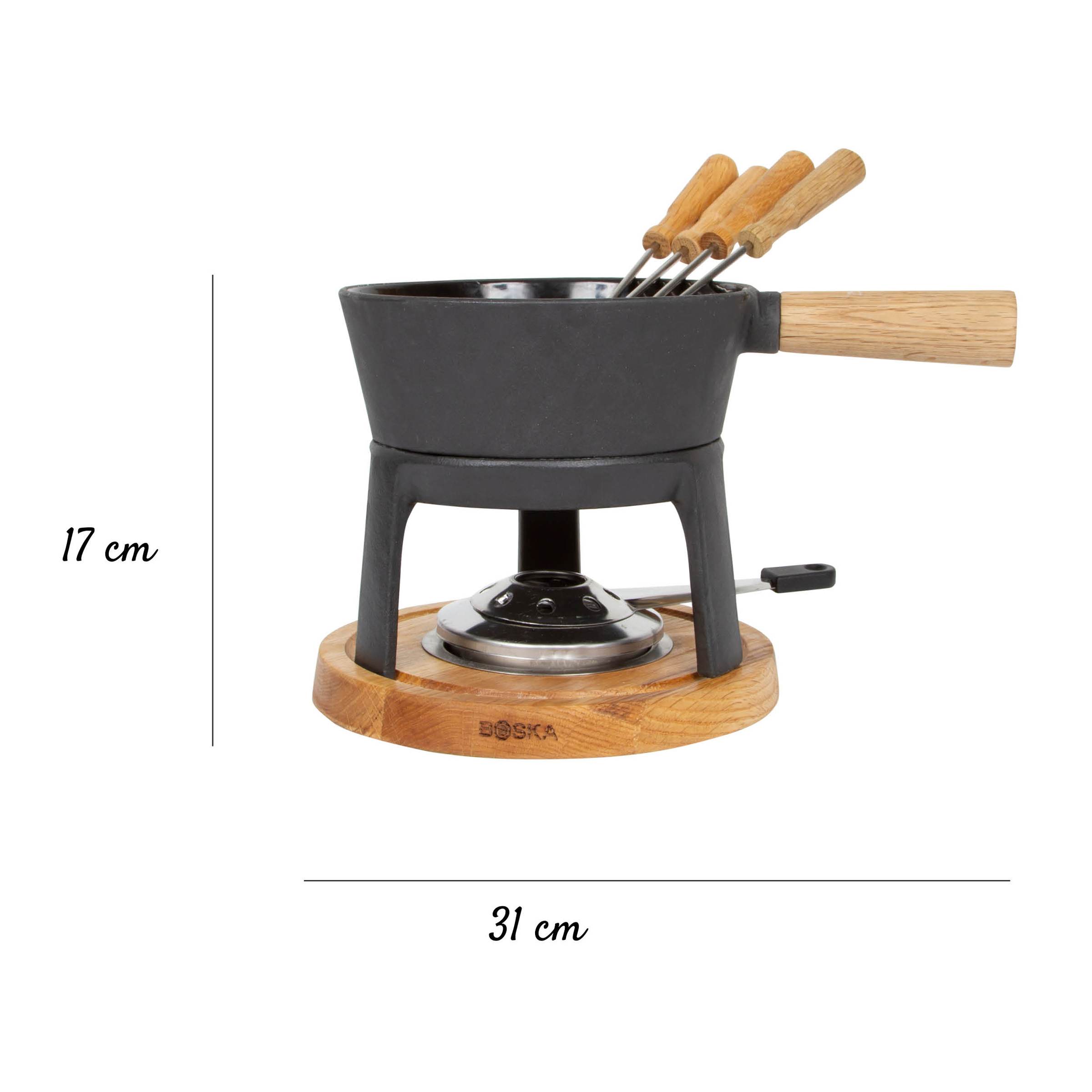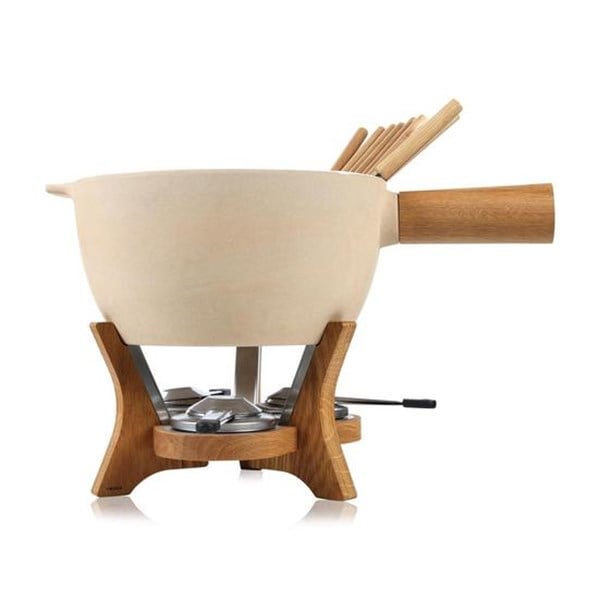 Das Set wird komplett mit einem Sockel, einem Brenner und sechs Fonduegabeln geliefert. Einsetzbar für alle Herdarten, auch Induktion.