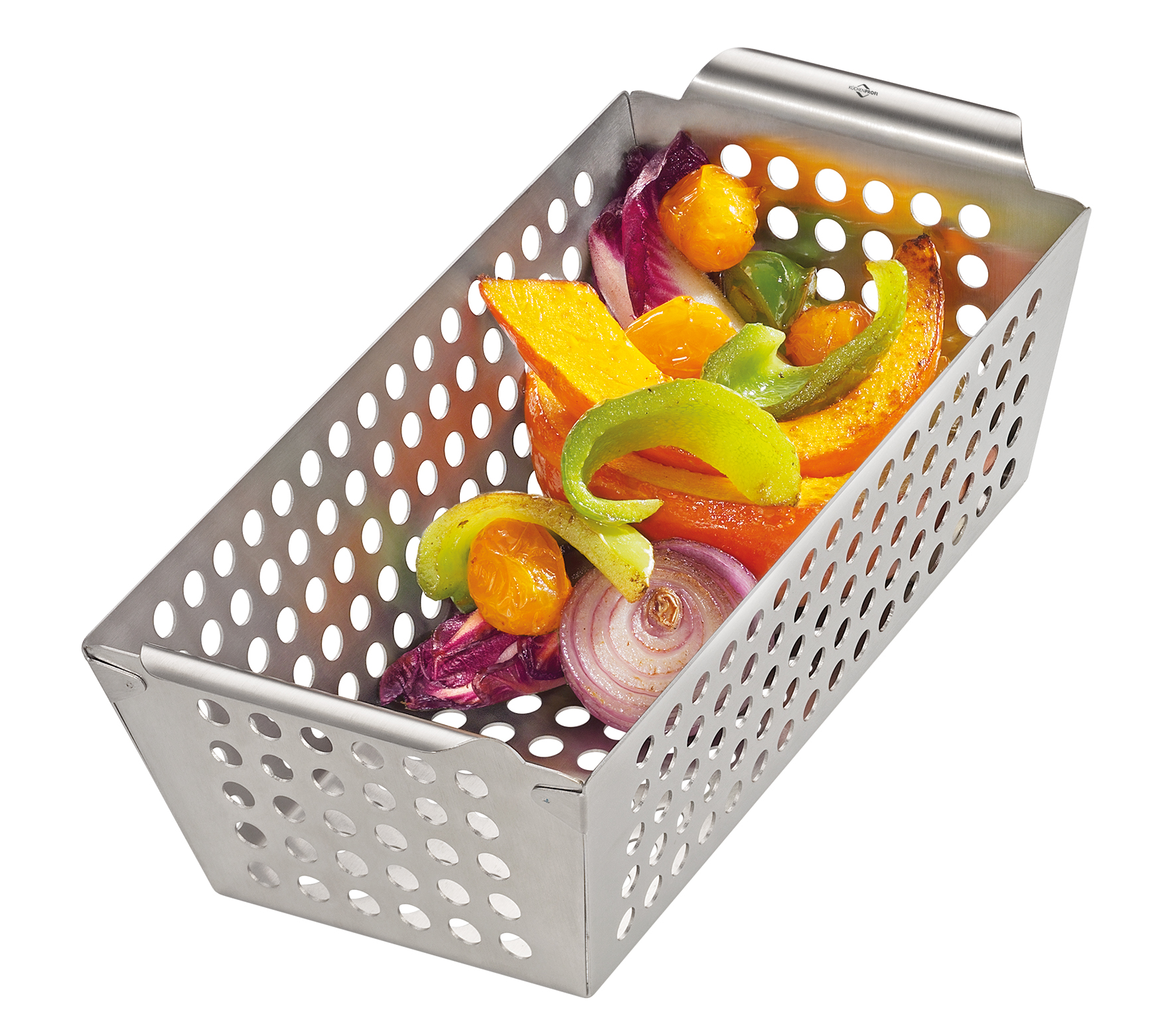 In dem Korb aus robustem Edelstahl garen Brokkoliröschen, Paprikastreifen, Pilze, Tomaten und weitere Gemüsesorten schonend. Geschmack und Biss der bunten Mischung bleiben erhalten, nichts kullert vom Rost. Übrigens macht sich auch Obst ganz hervorragend.