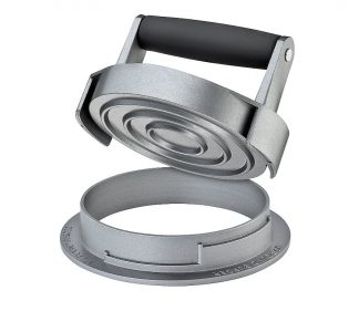 Drei davon! Die liefert die Hamburgerpresse TRIO von KÜCHENPROFI. Je nachdem, für welche Markierung auf dem Außenring des Stempels Sie sich entscheiden, erhalten Sie ein Burger-Patty von ca. 125, 170 oder 230 Gramm. Ihr Hunger entscheidet. Die Bedienung ist in jedem Fall einfach. Ölen Sie die untere Form leicht ein oder kleiden Sie sie mit Pergamentpapier aus. Legen Sie dann das Hackfleisch hinein und pressen Sie den oberen Teil fest darauf. Wer mag, peppt sein Patty mit „wet seasonings“, also frischen Chilis, Zwiebeln, oder pikanten Saucen, auf.