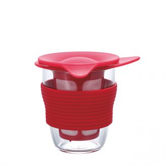 Handlicher Einzelportion Teebrüher (Trinkglas-Sieb Kombination). Der Deckel ist zugleich Unterteller für das gebrauchte Teesieb.