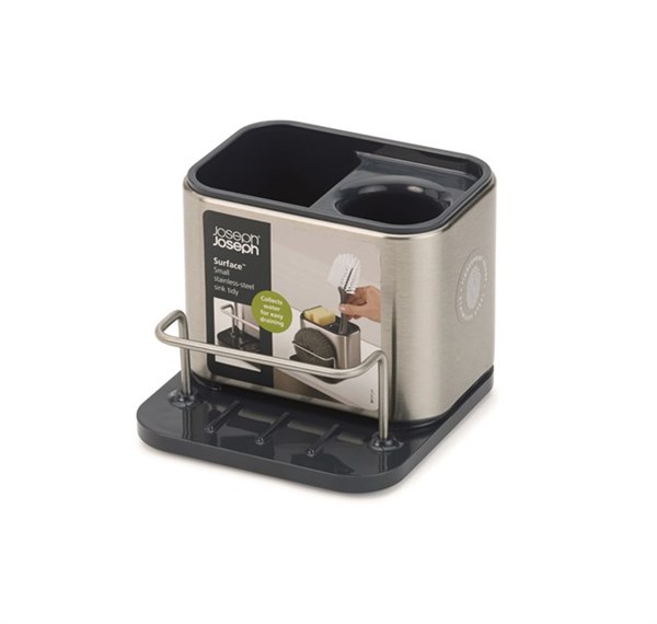 Bestehend aus einem Hauptfach für Spülmittel und Abwaschbürste, einer stabilen Leiste, um den feuchten Lappen aufzuhängen sowie einer gelochten Ablage,