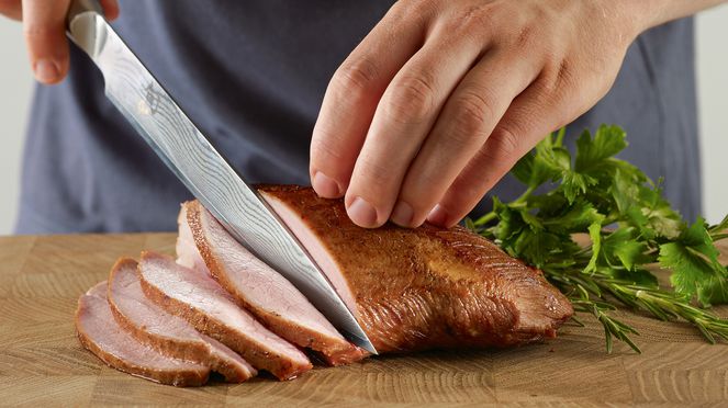 Durch die lange und nicht zu breite Klinge des Tranchiermesser bleibt kaum etwas daran kleben. Man schneidet mit der ganzen Klingenlänge des Tranchiermesser in einem Zug und kann so Braten oder Terrinen fein und sauber schneiden. Durch den konvexen Schliff der Klinge sowie die manuelle Honung jedes Messers entsteht eine unvergleichbare Schärfe, welche es wie kaum ein zweites selbst durch schwierigstes Schnittgut gleiten lässt. Diese Schärfe gepaart mit dem ausgewogenen Gewicht des Tranchiermessers erlaubt ein ermüdungsfreies Arbeiten.